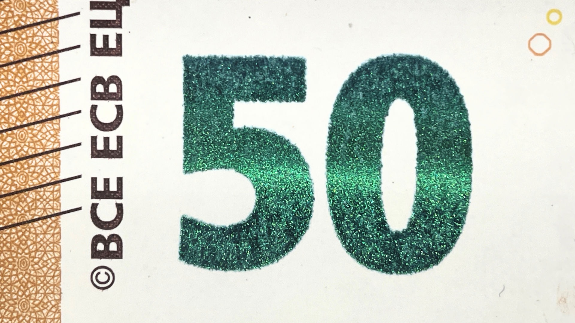 Euro banknotes feature microprinting, for example in the buildings on the front side and in the bridge structures on the reverse side. A magnifying glass is usually needed to read this. There are two different types of microtext: positive, with dark text on a light background, and negative, with light text on a dark background.
