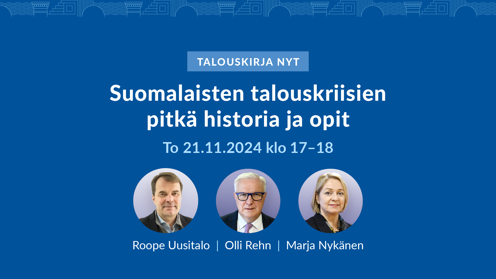 Keskustelemassa Suomen Pankin rahamuseossa ovat kirjan toimittanut taloustieteen professori Roope Uusitalo sekä yksi kirjan kirjoittajista Suomen Pankin pääjohtaja Olli Rehn. Keskustelua johdattelee Suomen Pankin johtokunnan varapuheenjohtaja Marja Nykänen.