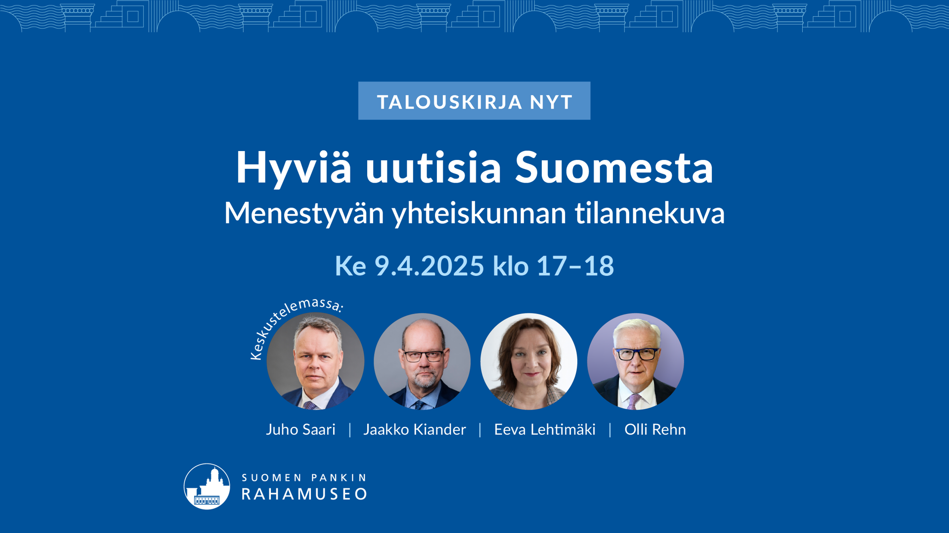 Keskustelemassa Suomen Pankin rahamuseossa ovat kirjan toimittanut professori Juho Saari, toimitusjohtaja Jaakko Kiander sekä toimittaja Eeva Lehtimäki. Keskustelua johdattelee Suomen Pankin johtokunnan puheenjohtaja Olli Rehn.