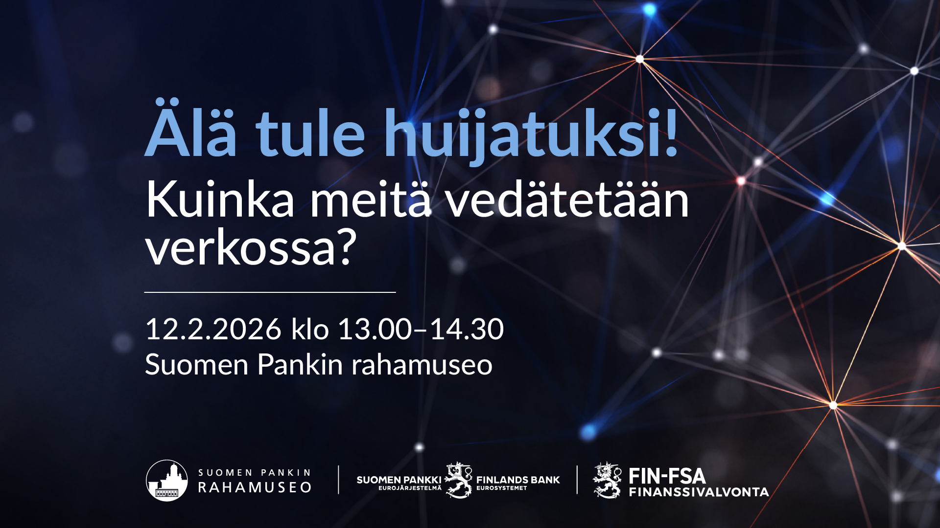 Miten huijauksia tehdään verkossa? Tule kuulemaan rahamuseoon, kun asiantuntijat avaavat, miten huijaukset verkossa syntyvät – ja miten niiltä voi suojautua. Finanssialan, poliisin, keskuspankin sekä Finanssivalvonnan edustajat keskustelevat konkreettisista keinoista tunnistaa ja torjua verkossa tapahtuvaa vedätystä.